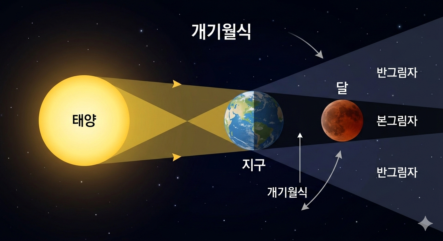 개기월식은 간단히 말해서 태양 - 지구 - 달이 우주 공간에서 아주 정확하게 일직선으로 늘어설 때 일어나는 현상이에요.