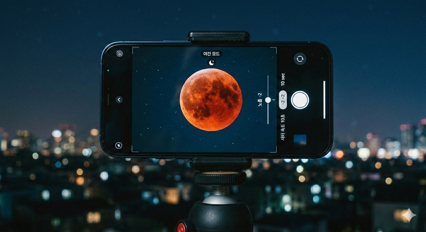 달은 생각보다 작게 찍혀요. 삼각대를 쓰거나 고정된 곳에 폰을 두고 '야간 모드'나 '노출 조절'을 활용해 보세요. 붉은 달의 느낌을 더 잘 살릴 수 있습니다.